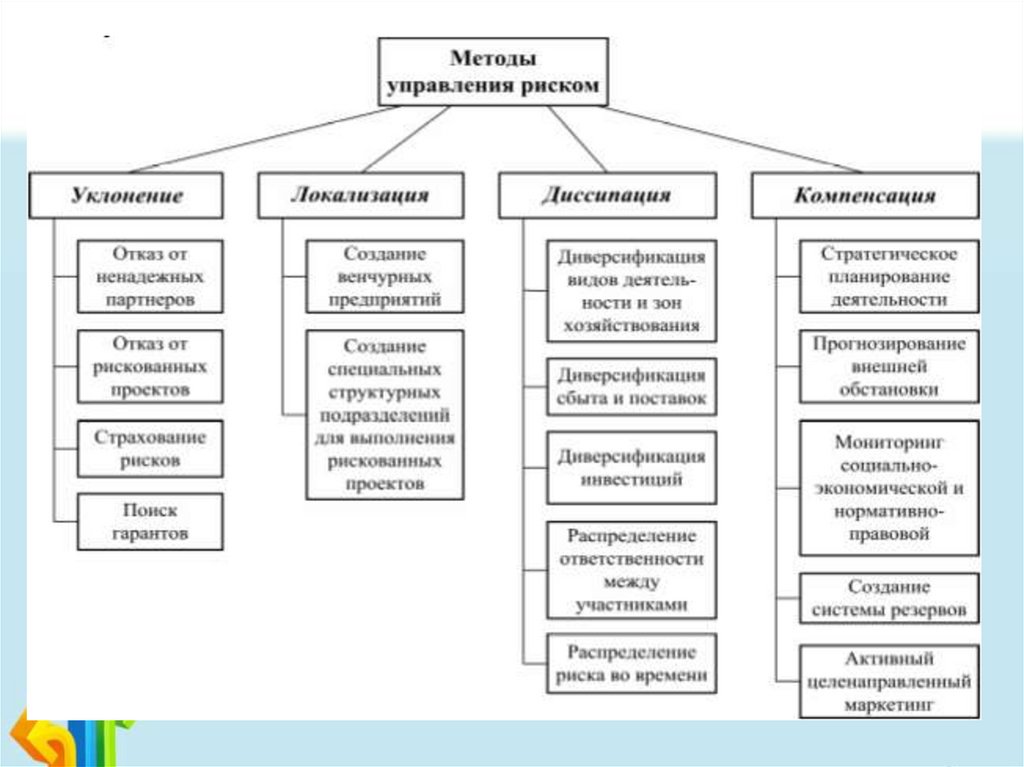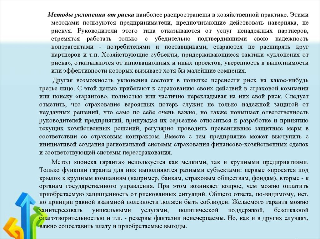 Методы уклонения от риска наиболее распространены в хозяйственной практике. Этимиметодами пользуются предприниматели, предпочитающие действовать наверняка, не
