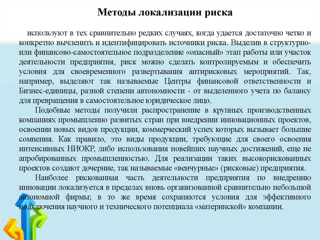 Методы локализации рискаиспользуют в тех сравнительно редких случаях, когда удается достаточно четко и