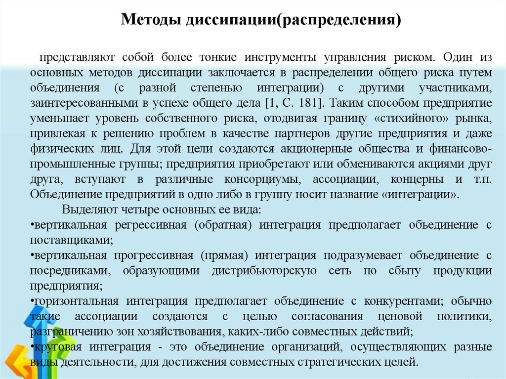 Методы диссипации(распределения)представляют собой более тонкие инструменты управления риском. Один из