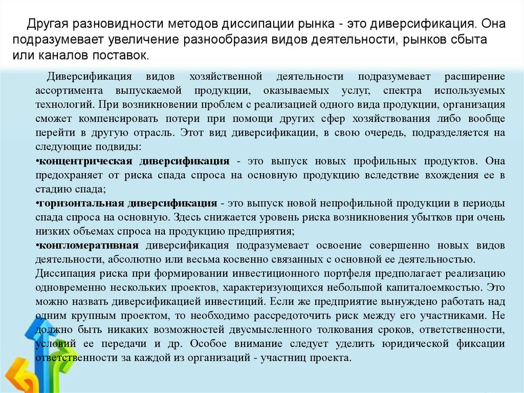 Другая разновидности методов диссипации рынка - это диверсификация. Онаподразумевает увеличение разнообразия видов деятельности, рынков сбыта