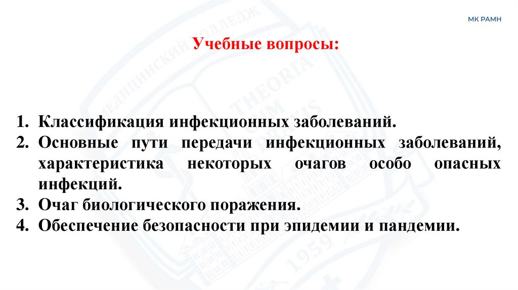Учебные вопросы:1. Классификация инфекционных заболеваний.