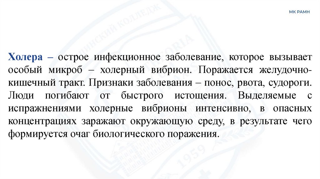 Холера – острое инфекционное заболевание, которое вызываетособый микроб – холерный вибрион. Поражается желудочнокишечный тракт. Признаки заболевания – понос, рвота, судороги.