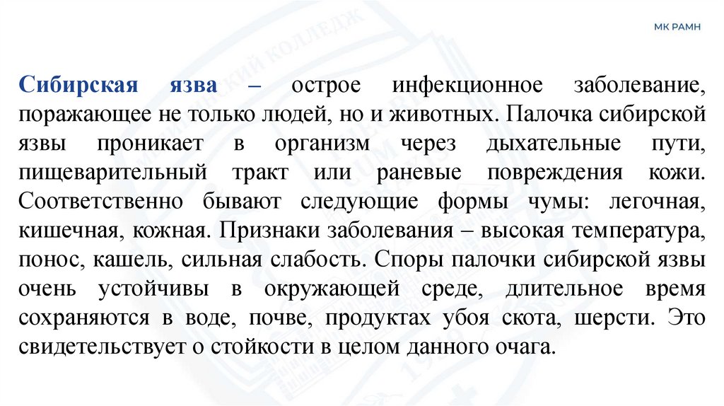 Сибирская язва – острое инфекционное заболевание,поражающее не только людей, но и животных. Палочка сибирской