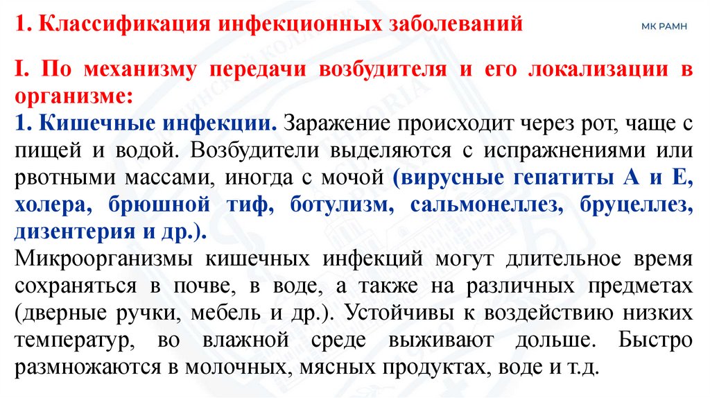 1. Классификация инфекционных заболеванийI. По механизму передачи возбудителя и его локализации в