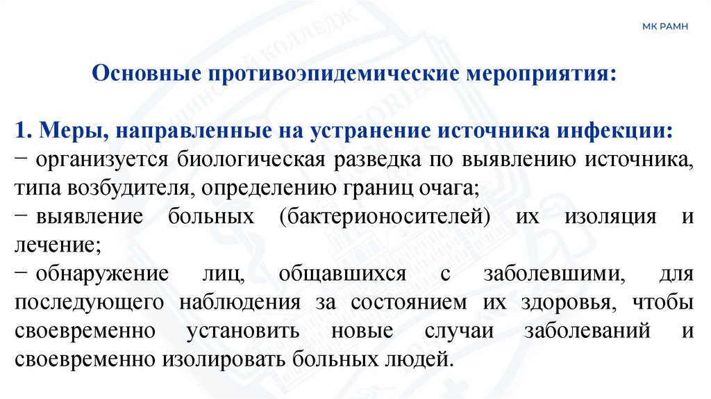 Основные противоэпидемические мероприятия:1. Меры, направленные на устранение источника инфекции:
