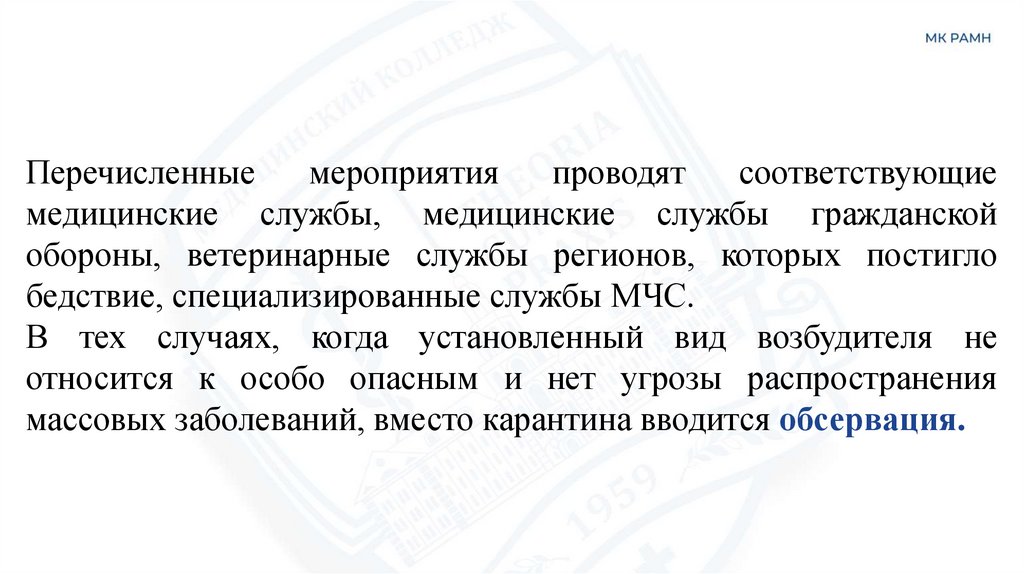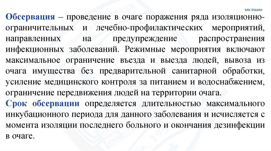 Обсервация – проведение в очаге поражения ряда изоляционноограничительных и лечебно-профилактических мероприятий,направленных