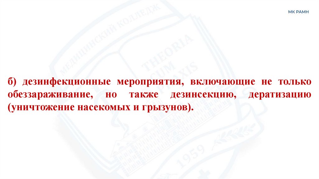 б) дезинфекционные мероприятия, включающие не толькообеззараживание, но также дезинсекцию, дератизацию