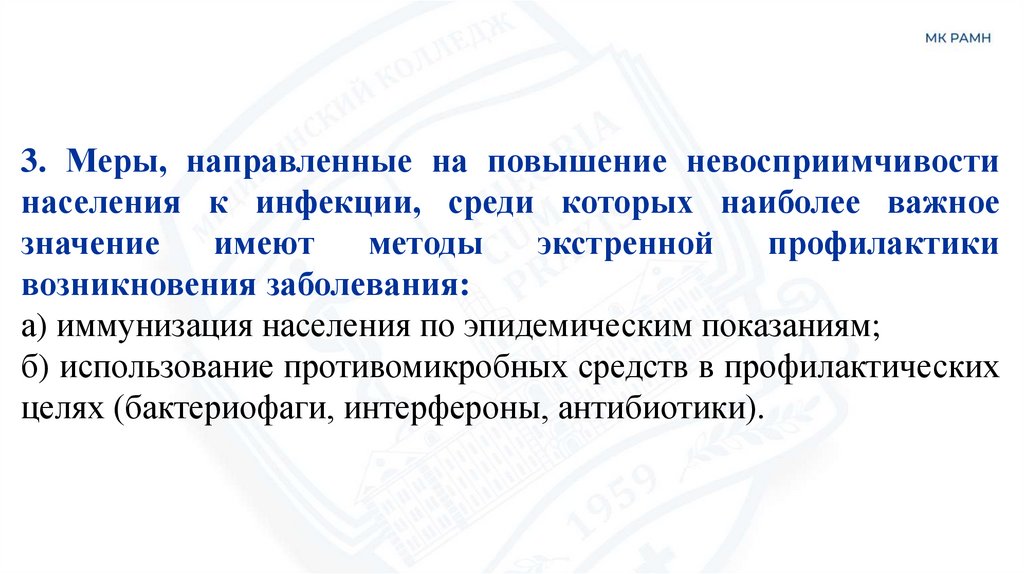 3. Меры, направленные на повышение невосприимчивостинаселения к инфекции, среди которых наиболее важное