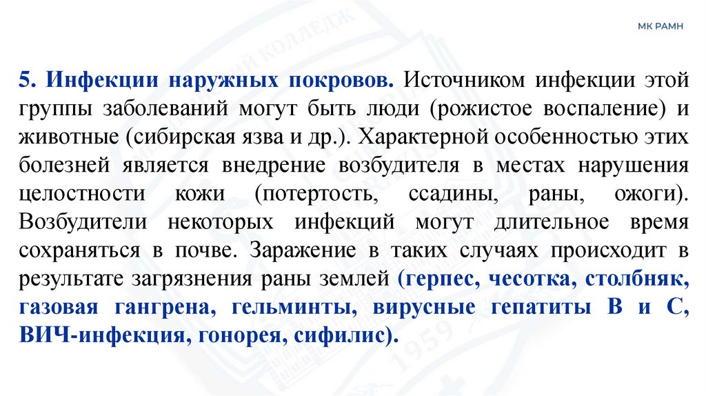5. Инфекции наружных покровов. Источником инфекции этойгруппы заболеваний могут быть люди (рожистое воспаление) и