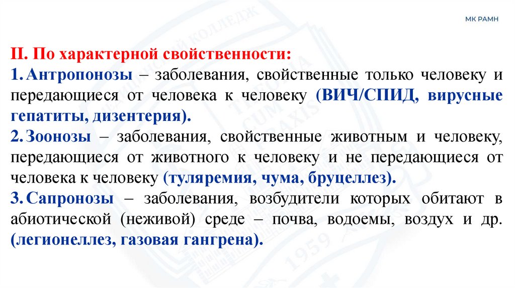 II. По характерной свойственности:1. Антропонозы – заболевания, свойственные только человеку и