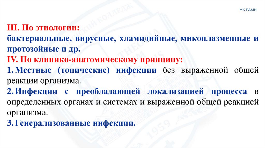 III. По этиологии:бактериальные, вирусные, хламидийные, микоплазменные и