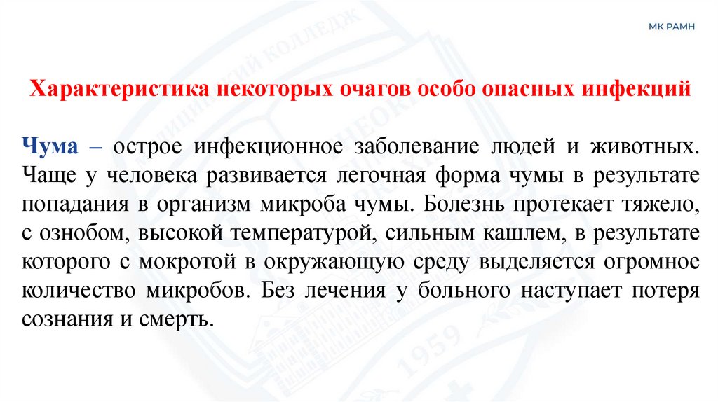Характеристика некоторых очагов особо опасных инфекцийЧума – острое инфекционное заболевание людей и животных.