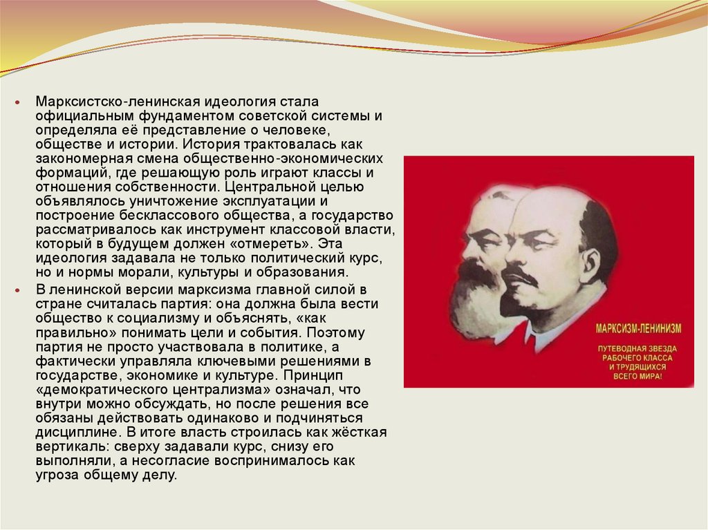 Марксистско-ленинская идеология сталаофициальным фундаментом советской системы и