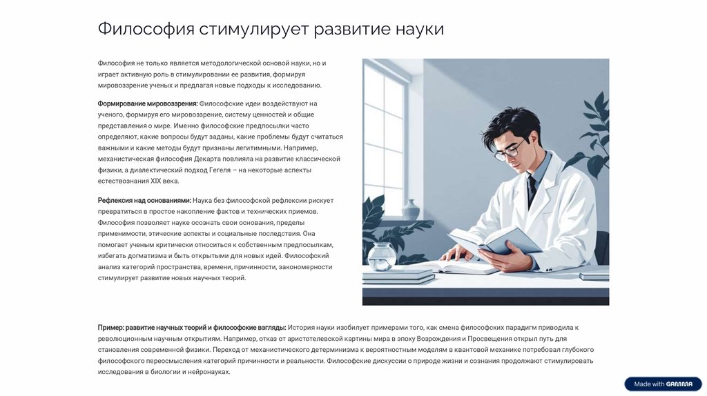 Философия помогает осмыслить основания и границы научного знания, заставляя ученых задаваться вопросами о достоверности своих методов, о