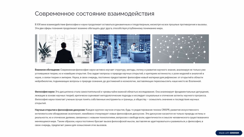Современное состояние взаимодействияВ XXI веке взаимодействие философии и науки продолжает оставаться динамичным и плодотворным, несмотря на все прошлые противоречия и вызовы.