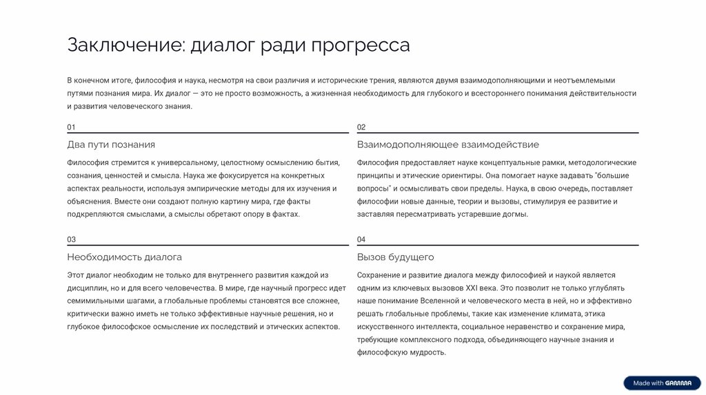 Заключение: диалог ради прогрессаВ конечном итоге, философия и наука, несмотря на свои различия и исторические трения, являются двумя взаимодополняющими и неотъемлемыми