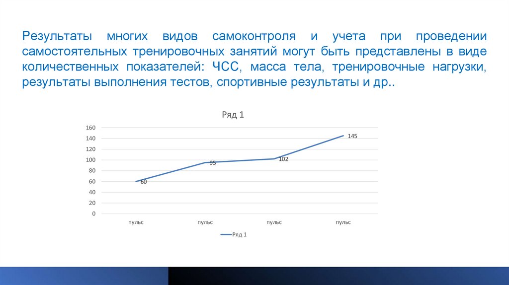 Результаты многих видов самоконтроля и учета при проведениисамостоятельных тренировочных занятий могут быть представлены в виде