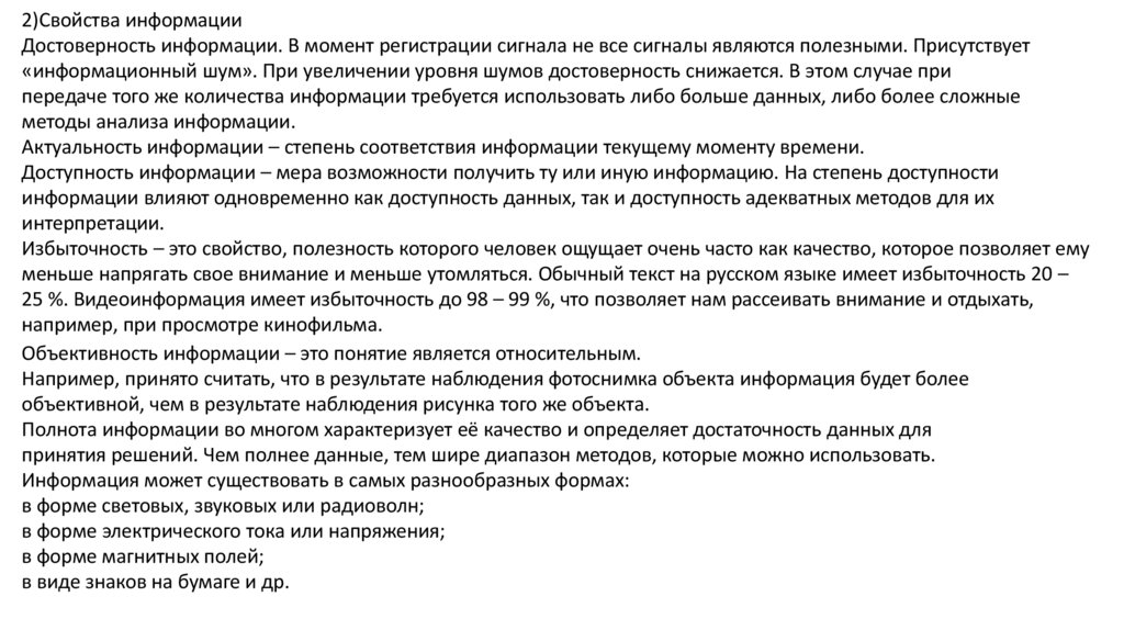 2)Свойства информацииДостоверность информации. В момент регистрации сигнала не все сигналы являются полезными. Присутствует