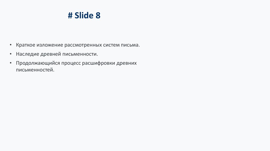 # Slide 8• Краткое изложение рассмотренных систем письма.