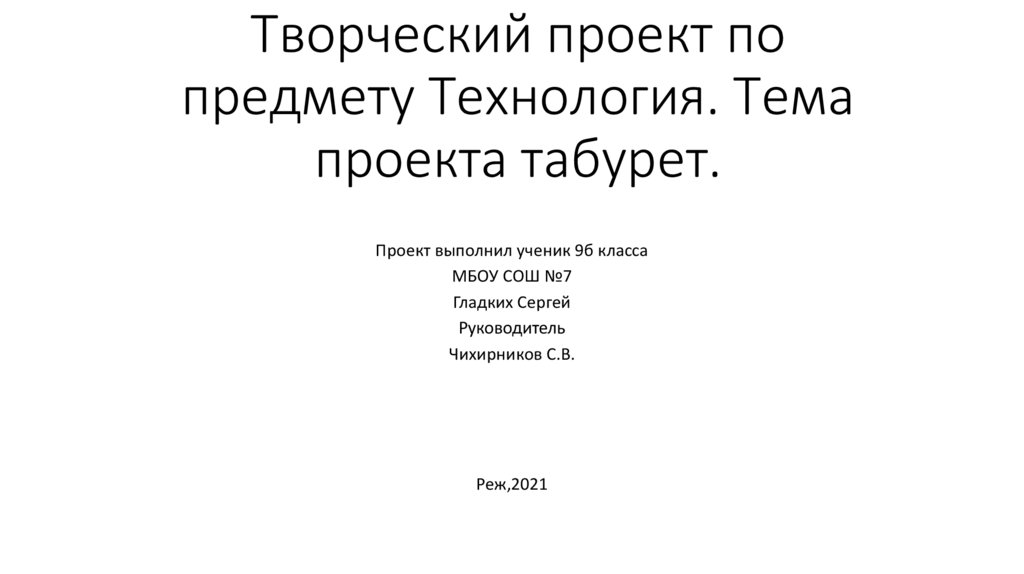 1. Творческий проект по предмету Технология. Тема проекта табурет.