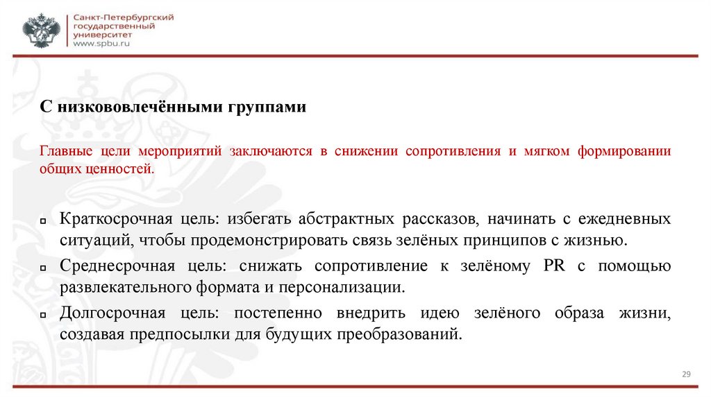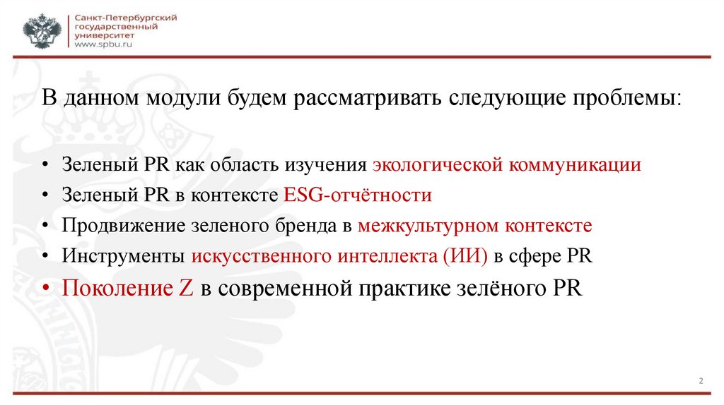 В данном модули будем рассматривать следующие проблемы:• Зеленый PR как область изучения экологической коммуникации