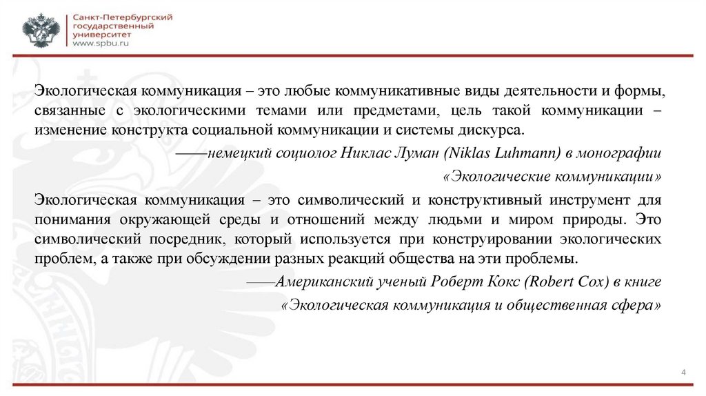 Экологическая коммуникация представляет собой символический и конструктивный инструмент для восприятия,