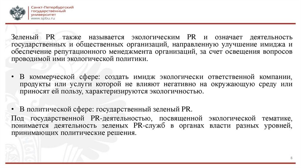 Зеленый PR также называется экологическим PR и означает деятельностьгосударственных и общественных организаций, направленную улучшение имиджа и