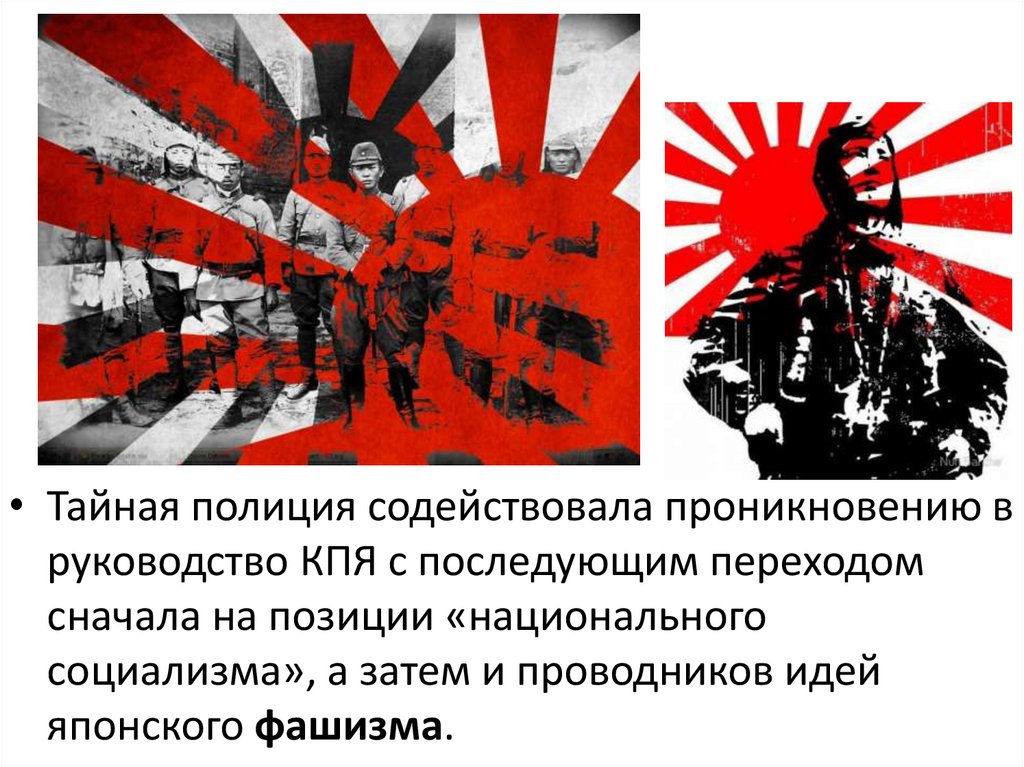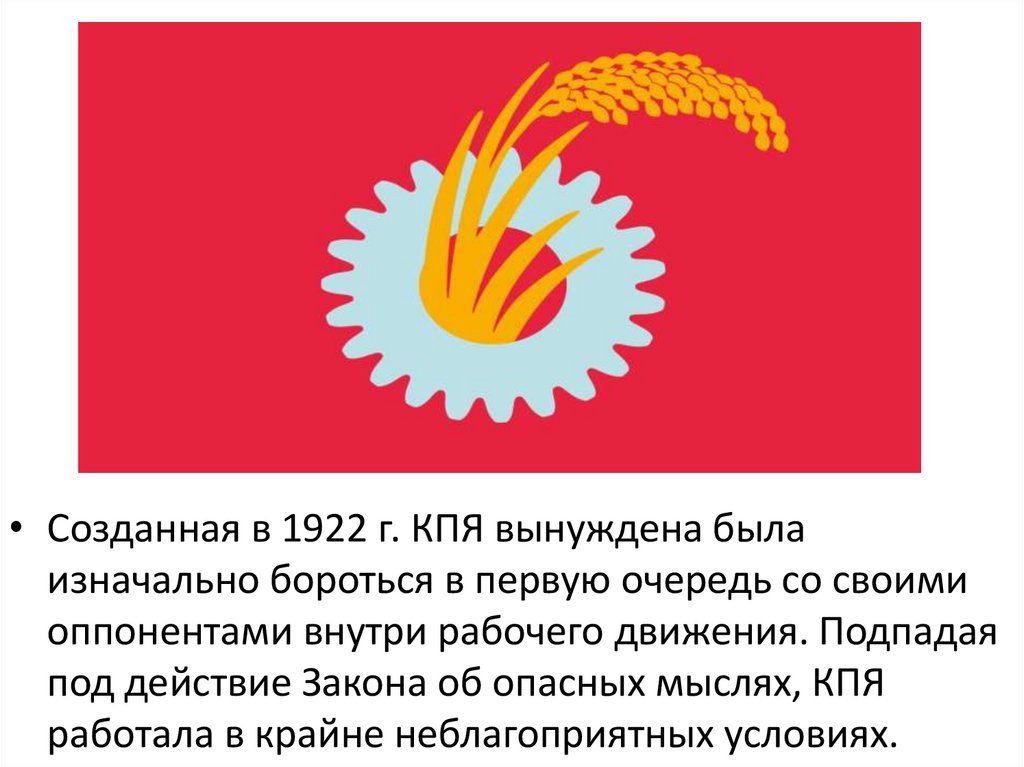 • Созданная в 1922 г. КПЯ вынуждена былаизначально бороться в первую очередь со своими