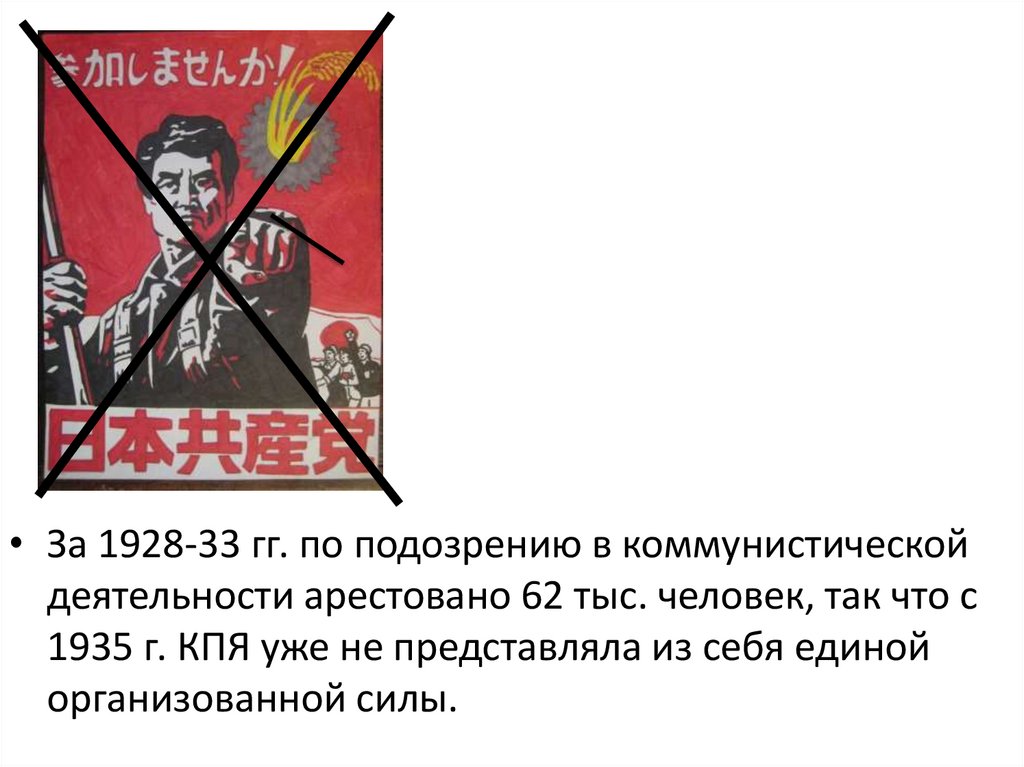 • За 1928-33 гг. по подозрению в коммунистическойдеятельности арестовано 62 тыс. человек, так что с