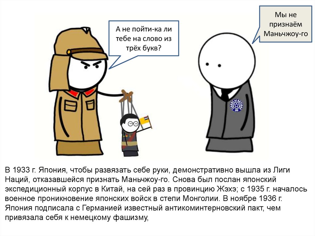 Наций, отказавшейся признать Маньчжоу-го. Снова был послан японский