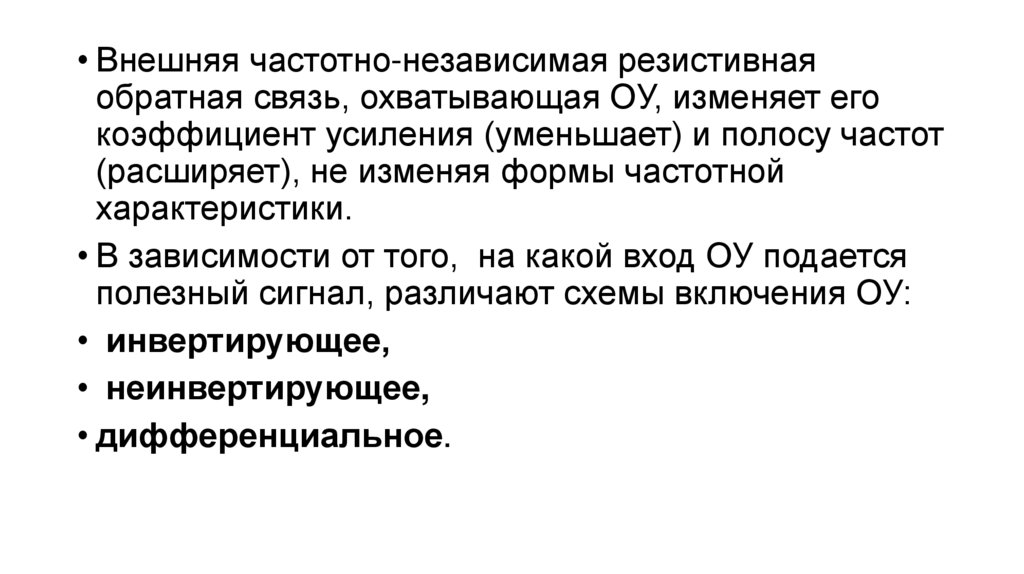 • Внешняя частотно-независимая резистивнаяобратная связь, охватывающая ОУ, изменяет его
