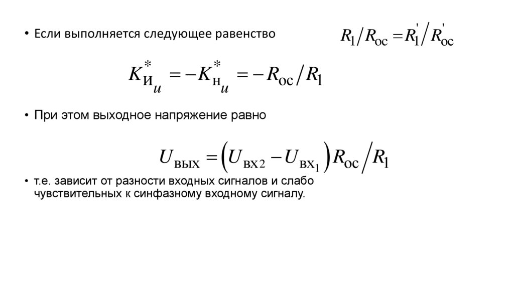• При R1 = R3 и R2 = R4 и идеальном ОУ