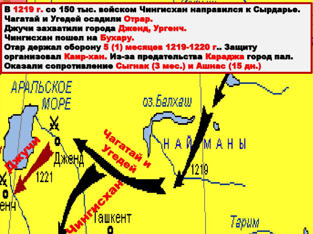 В 1219 г. со 150 тыс. войском Чингисхан направился к Сырдарье.Чагатай и Угедей осадили Отрар.