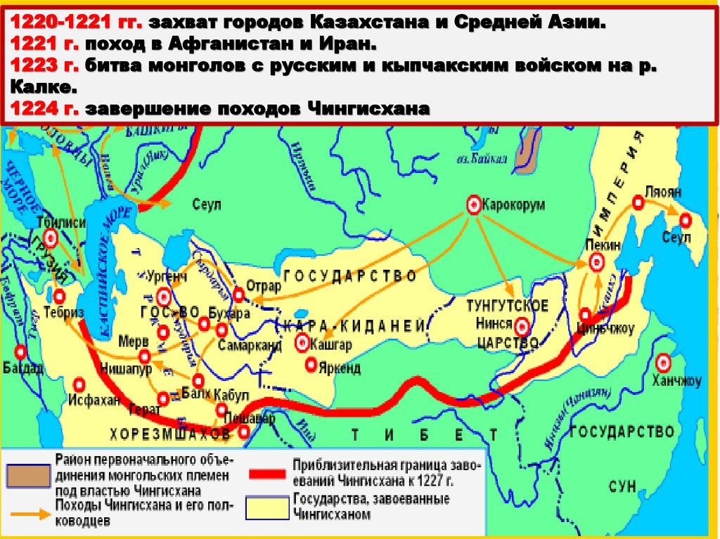1220-1221 гг. захват городов Казахстана и Средней Азии.1221 г. поход в Афганистан и Иран.