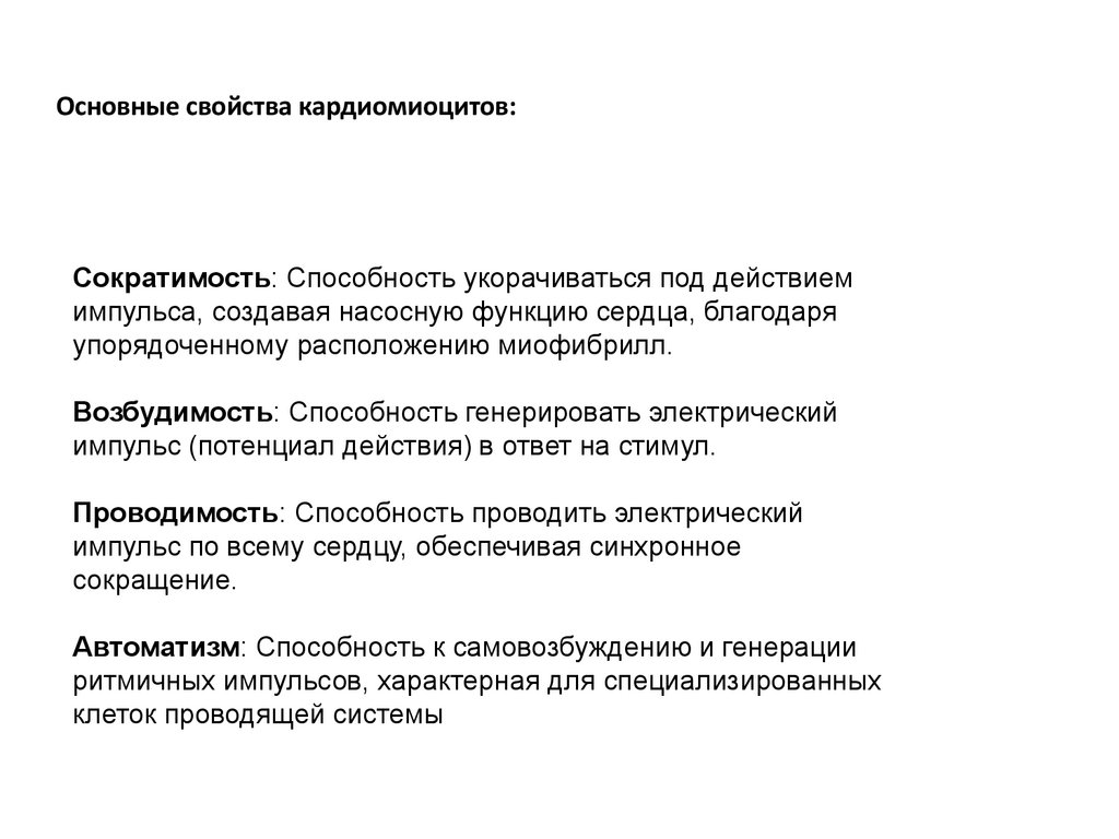 Основные свойства кардиомиоцитов:Сократимость: Способность укорачиваться под действием