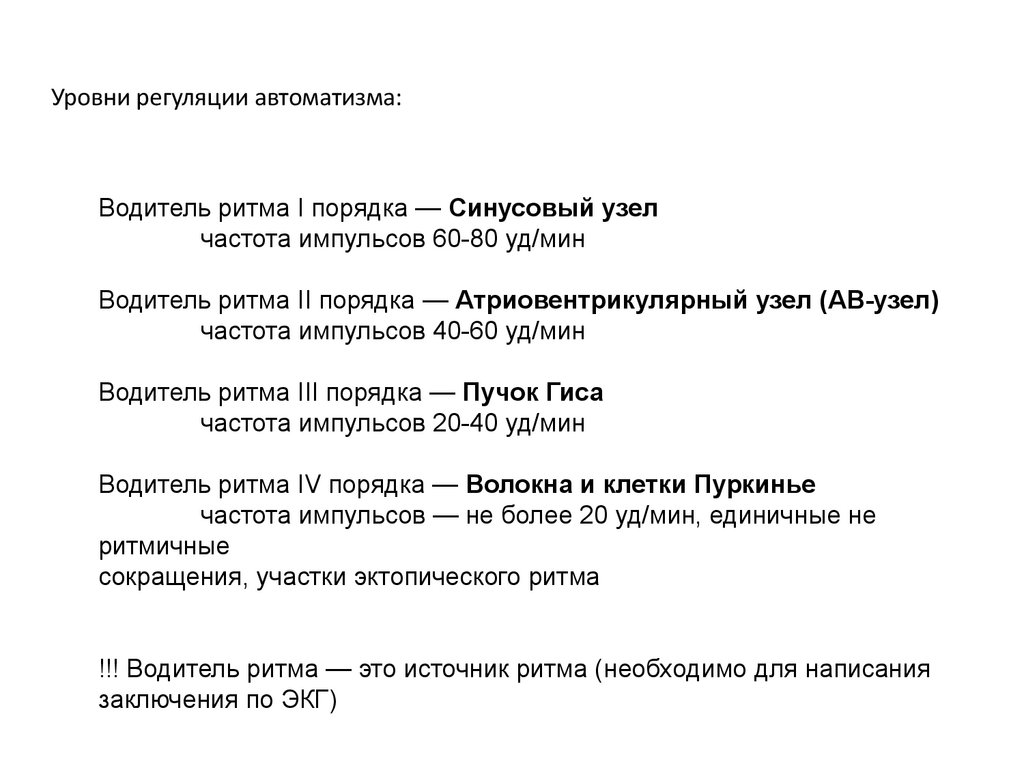 Уровни регуляции автоматизма:Водитель ритма I порядка — Синусовый узел