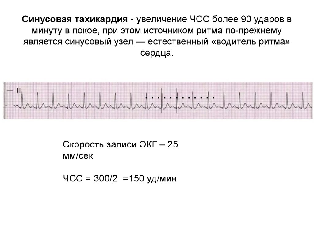 При скорости ленты 25 мм/с: ЧСС = 300 / (число больших квадратов).