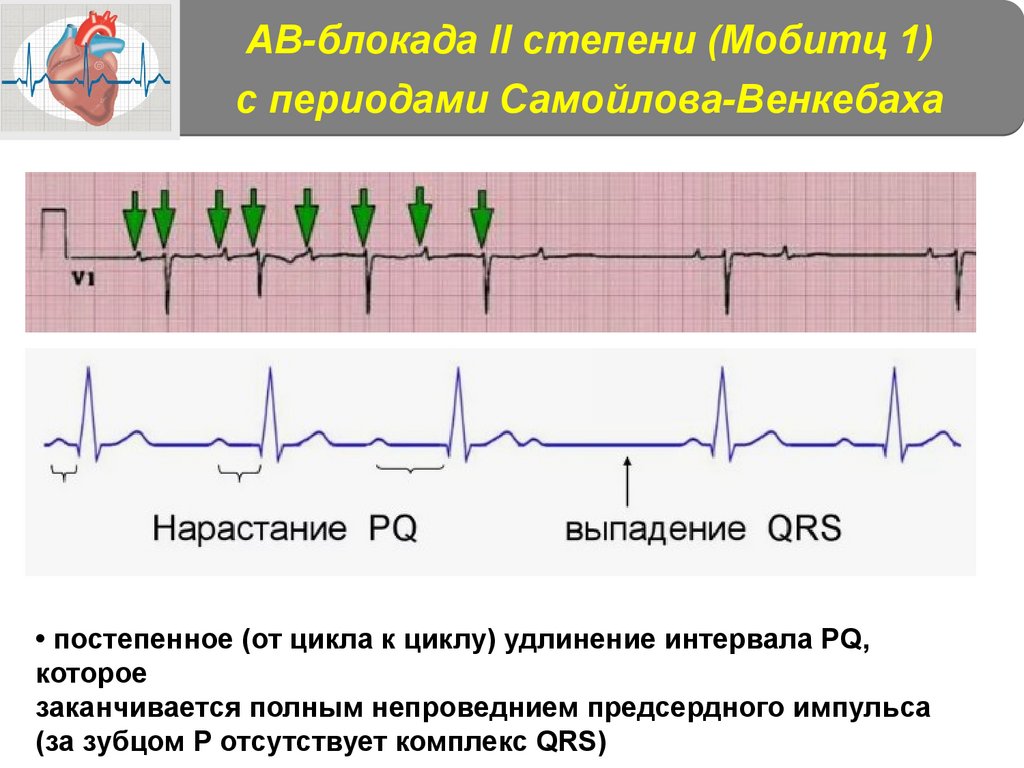 • постепенное (от цикла к циклу) удлинение интервала PQ,