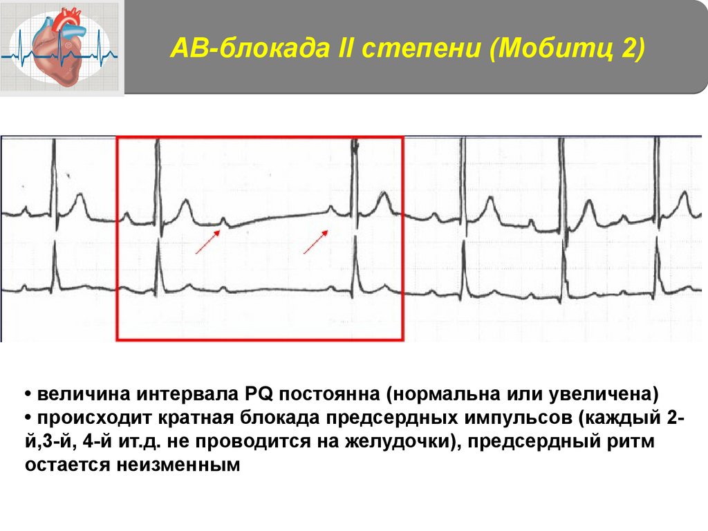 АВ-блокада II степени (Мобитц 2)• величина интервала PQ постоянна (нормальна или увеличена)
