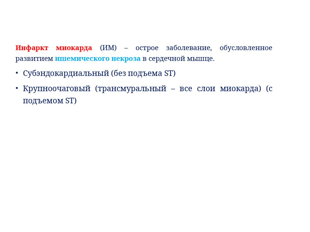 • Субэндокардиальный (без подъема ST)