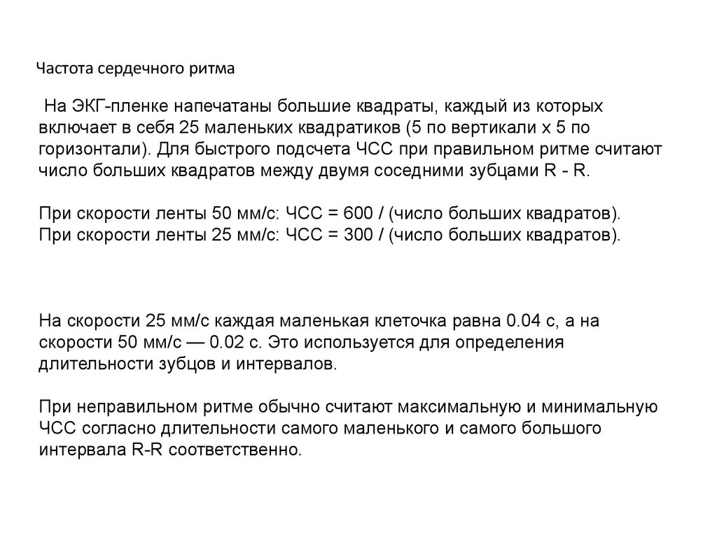 При скорости ленты 50 мм/с: ЧСС = 600 / (число больших квадратов).