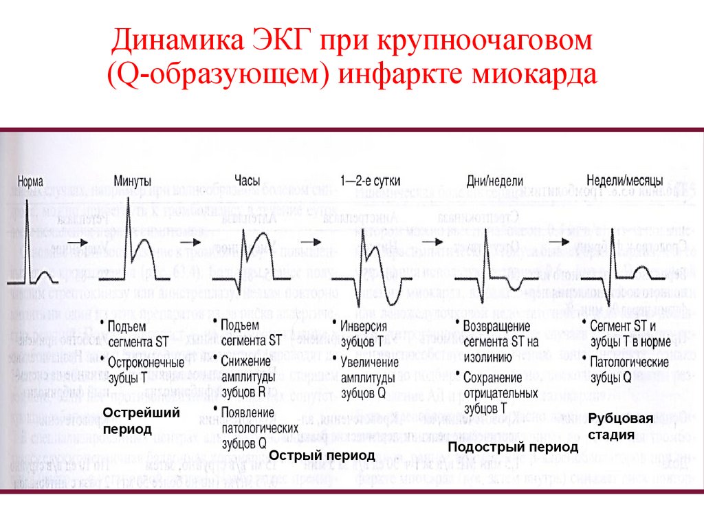 Динамика ЭКГ при крупноочаговом(Q-образующем) инфаркте миокарда