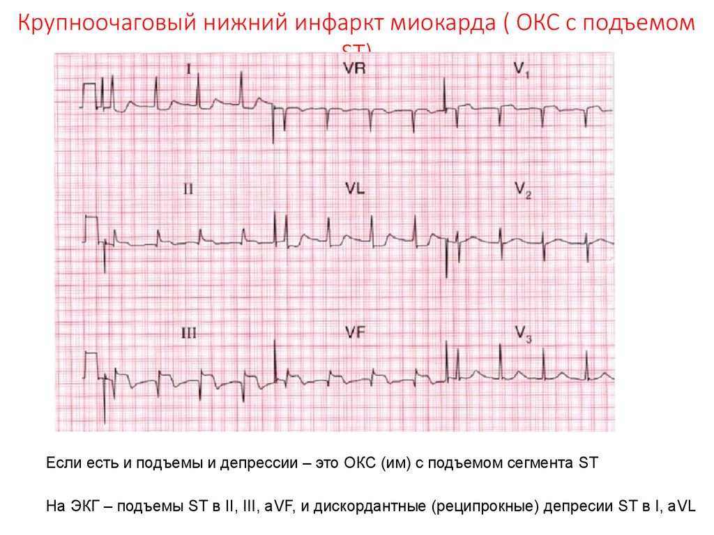 На ЭКГ – подъемы ST в II, III, aVF, и дискордантные (реципрокные) депресии ST в I, aVL