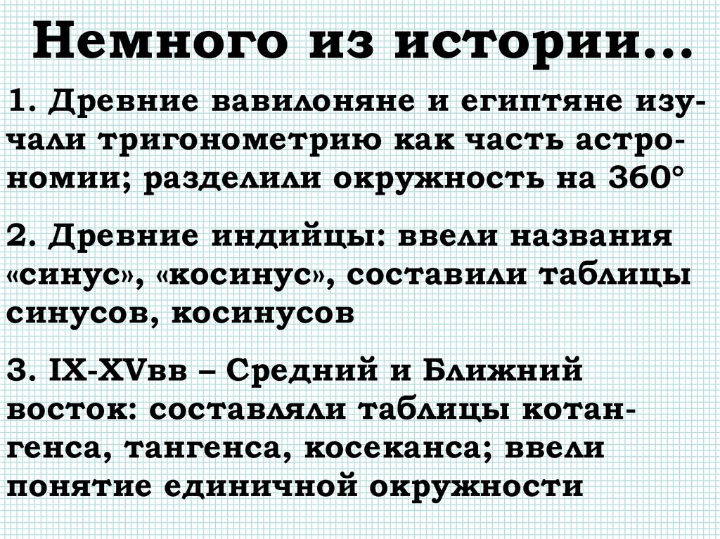 Немного из истории…1. Древние вавилоняне и египтяне изучали тригонометрию как часть астрономии; разделили окружность на 360