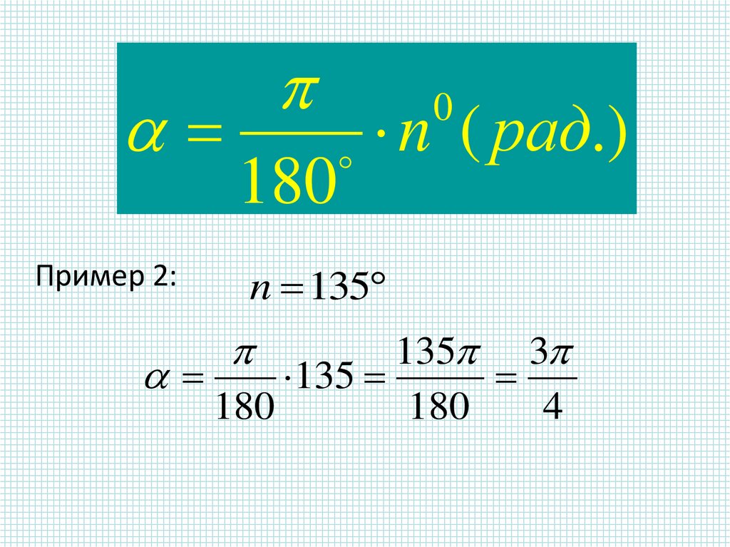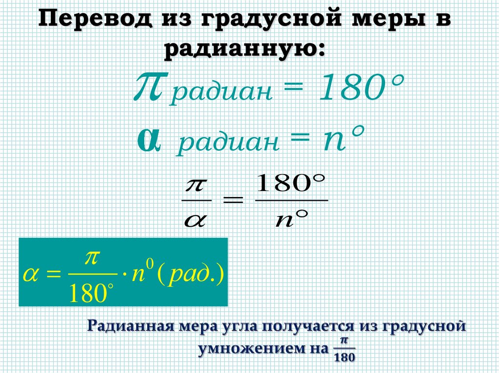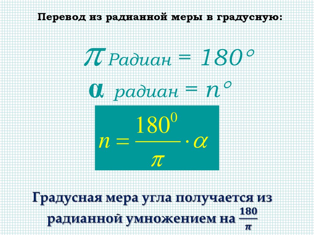 Перевод из радианной меры в градусную:Радиан = 180