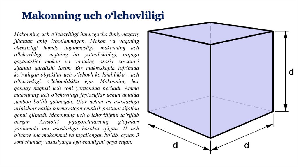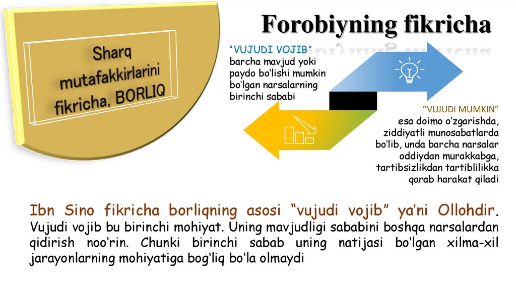 - Atrof olam, predmetlar, hodisalar real mavjud bo’ladi, u (olam) bor;