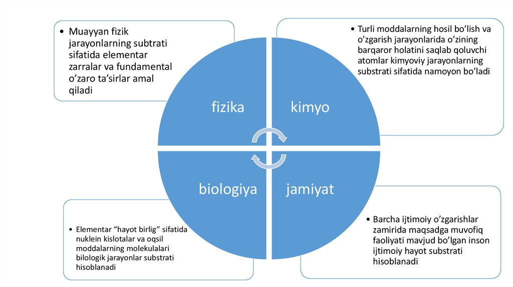 fizikaviy jarayonlar davom etishi; kimyoviy elimentlar
