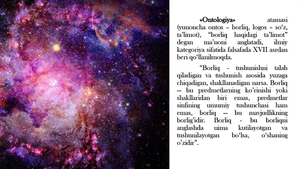 Borliq – bu real mavjud, o’z ichiga barcha jismlarni oladigan,barqaror, mustaqil, doimiy, cheksiz substansiyadir.