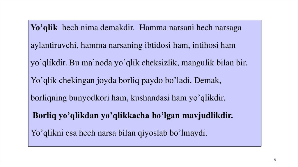 Borliq yo’qlikdan yo’qlikkacha bo’lgan mavjudlikdir.