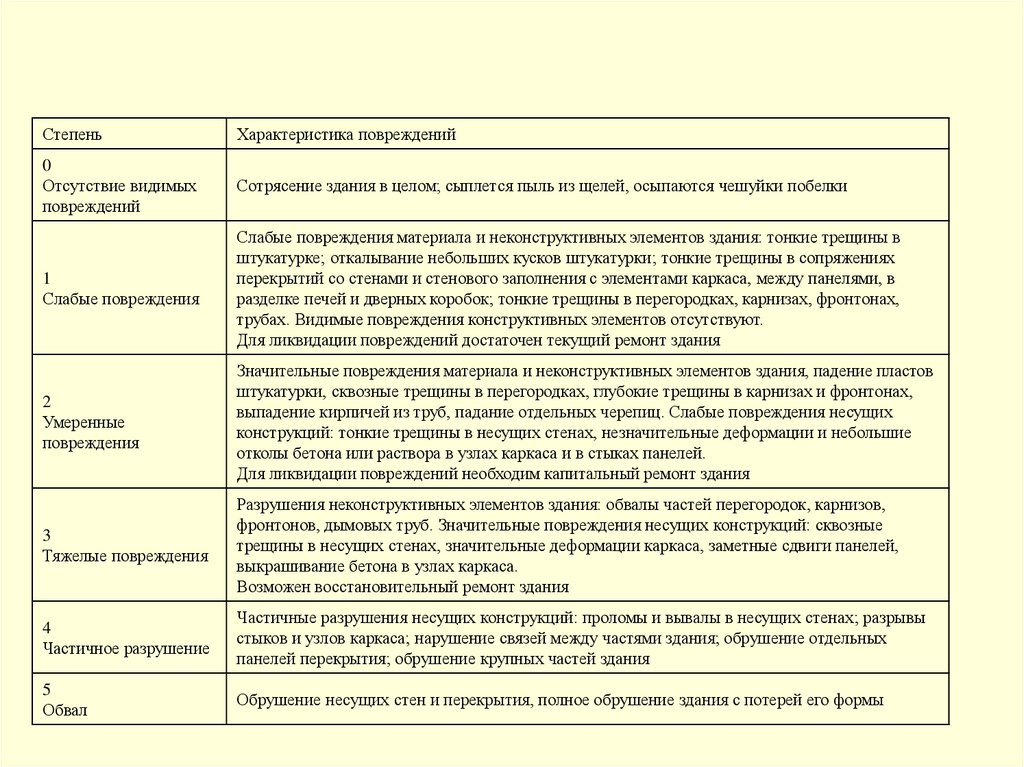 выпадение кирпичей из труб, падание отдельных черепиц. Слабые повреждения несущих